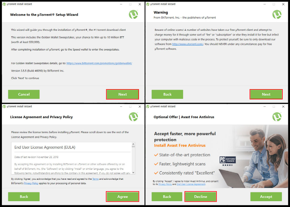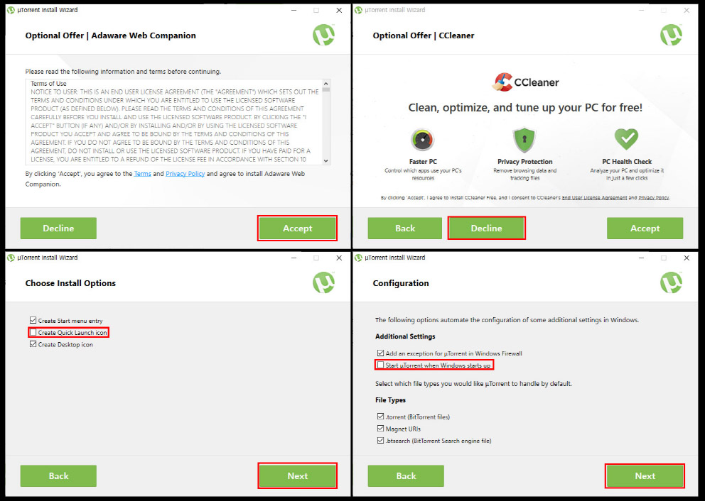 사진의 순서는 사진 밑 작은 글씨의 설명란을 참고하여주시고 사진의 순서에 따라 빨간색 체크박스가 있는 버튼을 클릭하여 주시면 되겠습니다 4번째 사진에 Accept 버튼을 클릭하시게 되면 해당 사진 속에 설명하고 있는 어플이 자동으로 설치되는 것이니 체크가 되어있듯이 Decline버튼으로 넘어가주시면 되겠습니다.
