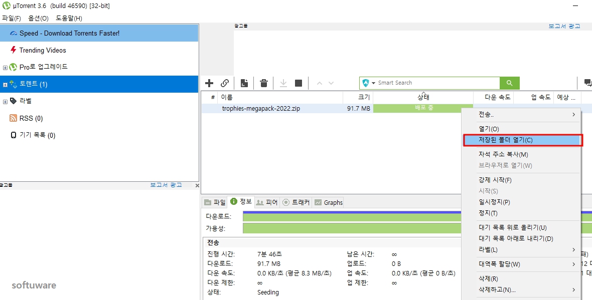 더블클릭이나 마우스 오른쪽 클릭 후 '저장된 폴더 열기'를 통해 파일이 잘 다운받아졌는지 확인해줍니다.