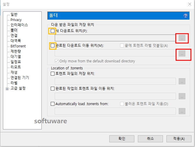 그리고 이제 새 다운로드 위치, 완료된 다운로드 이동 위치를 각각 체크해주시고,