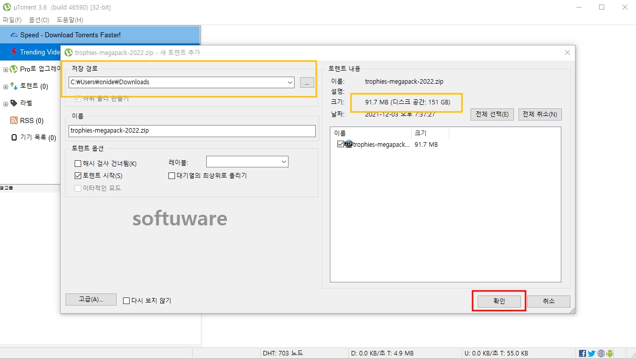 그리고 확인을 눌러주시면 토렌트 파일이 다운됩니다.