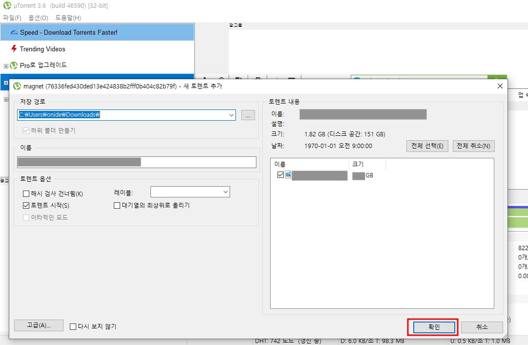 그리고 확인을 눌러주시면 토렌트 파일이 다운됩니다.