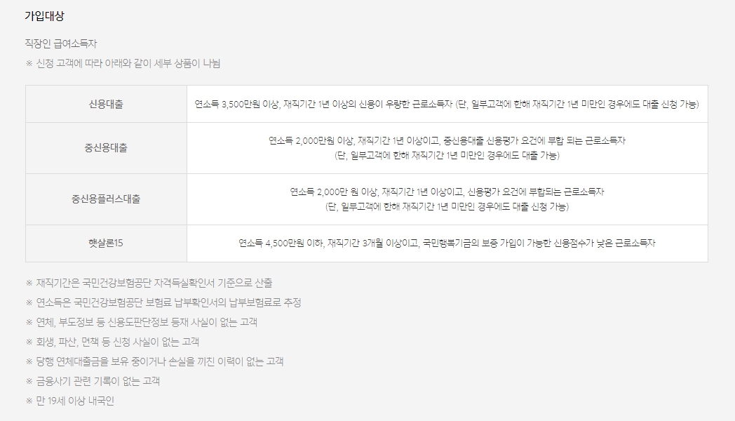 일반적인 신용대출의 경우, 연소들 3,500만원 이상, 재직기간 1년 이상의 신용이 우량한 근로소득자이어야 합니다.