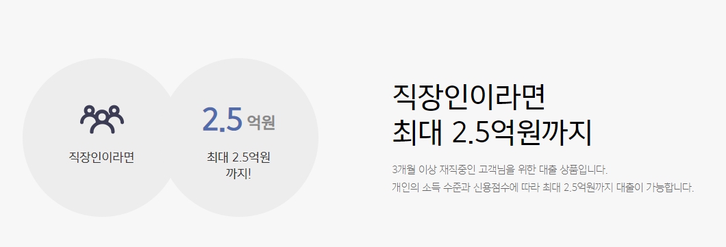 3개월 이상 재직중인 직장인이라면 최대 2.5억원까지 대출이 가능합니다.