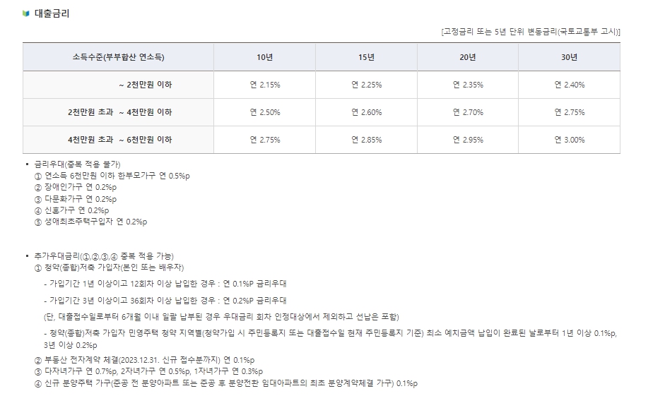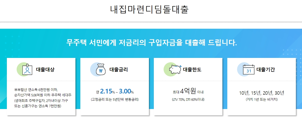 무주택서민들에게 저금리의 주택 구입자금을 대출해주고자 만들어진 대출상품입니다.