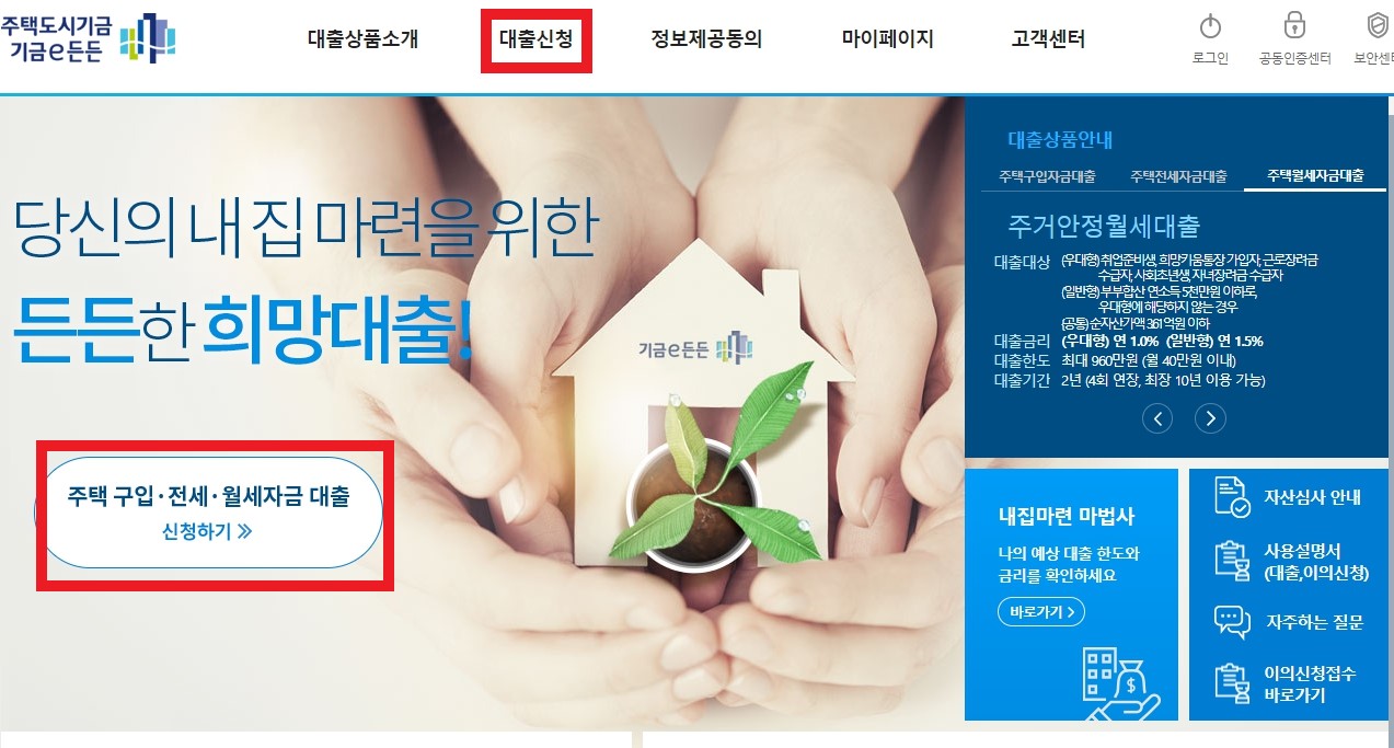 주택도시기금 대출상품소개, 대출신청, 대출신청현황 조회, 대출실행내역 조회, 소명자료 제출
