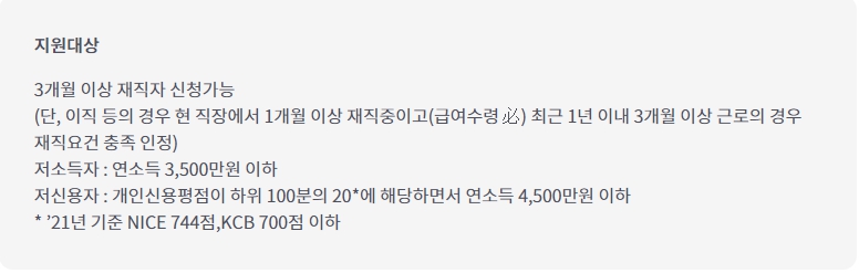 (단, 이직 등의 경우 현 직장에서 1개월 이상 재직중이고(급여수령 必) 최근 1년 이내 3개월 이상 근로의 경우 재직요건 충족 인정)