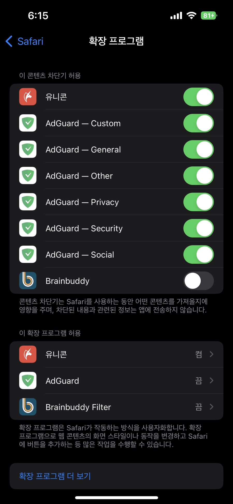 모두 켜주었습니다. 이제 사파리를 이용하면서 유튜브 광고 없이 유튜브를 시청하실 수 있습니다.