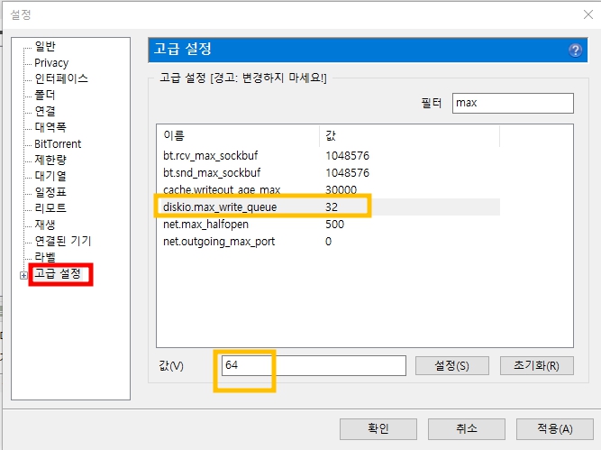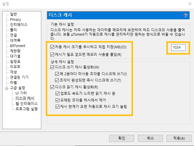 보통 우리가 사용하는 4gb이상의 메모리를 사용한다면 1024를 입력해서 토렌트 속도를 올릴 수 있습니다.