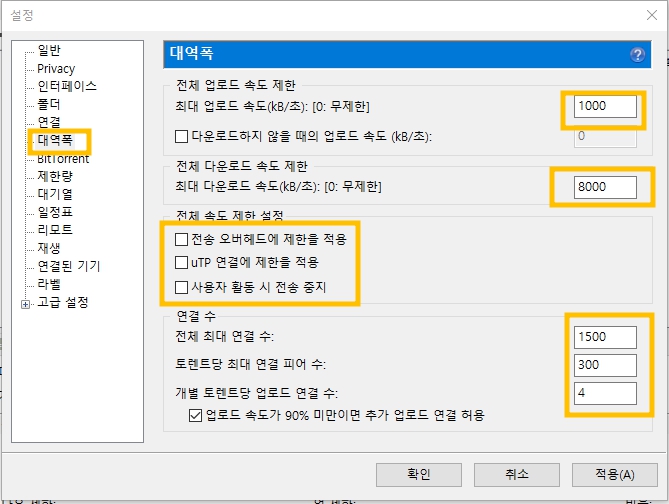개별 토렌트당 업로드 연결수는 4로 해줍니다.