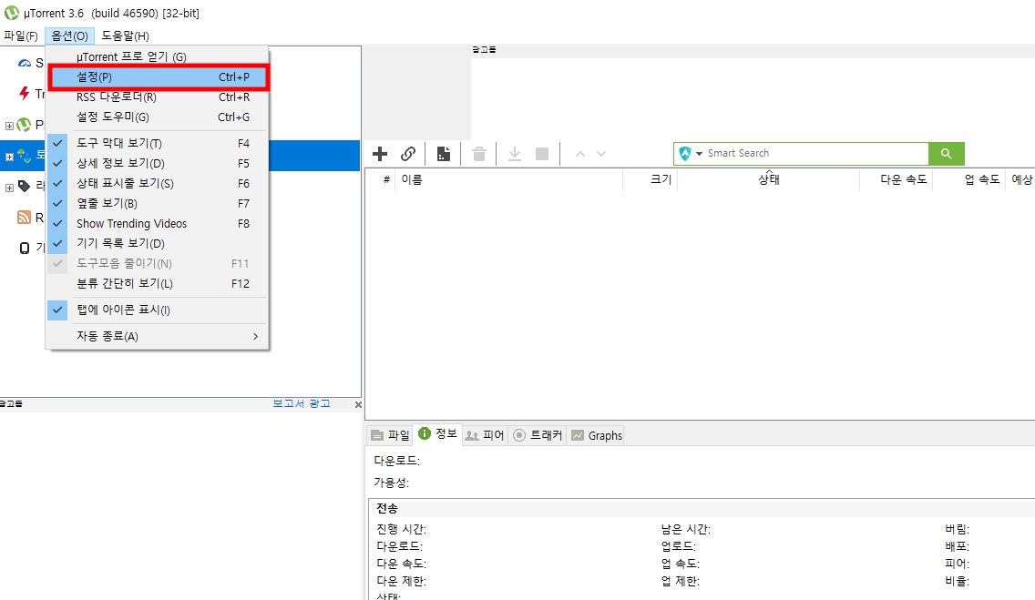 토렌트 실행 후 상단 메뉴에서 옵션 -> 설정을 클릭해줍니다.