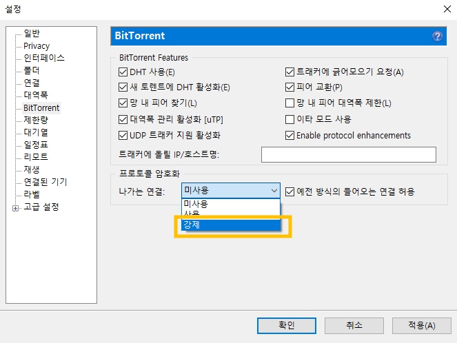프로토콜 암호화에서 나가는 연결을 '강제'로 바꾸어줍니다.