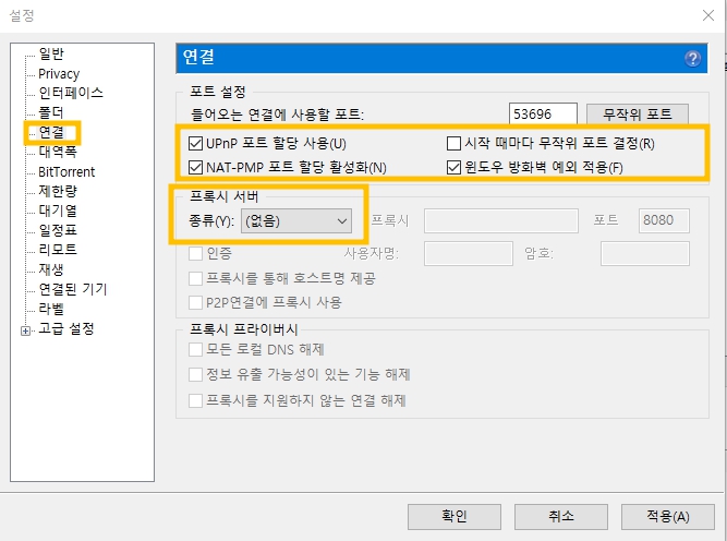 Upnp 포트 할당 사용, NAT-PMP 포트 할당 활성화, 왼도우 방화벽 예외 적용에 체크해줍니다.