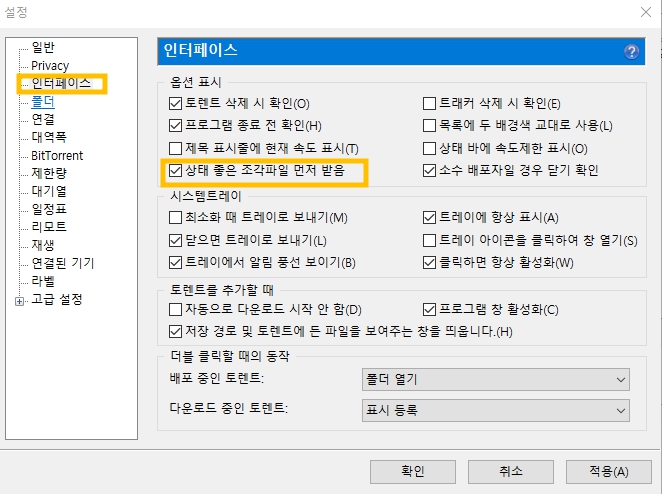 설정 메뉴들 중 인터페이스 탭을 클릭해준 뒤, 상태 좋은 조각파일 먼저 받음에 체크해줍니다.